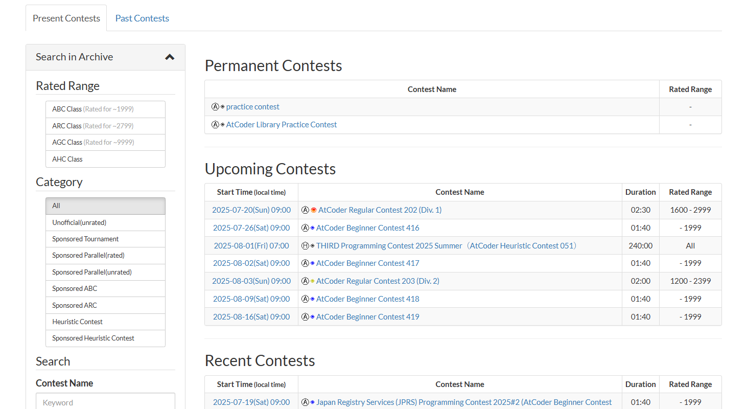 - Beginner Contest (ABC): Voltado para iniciantes, é ideal para praticar os fundamentos de algoritmos e estruturas de dados.