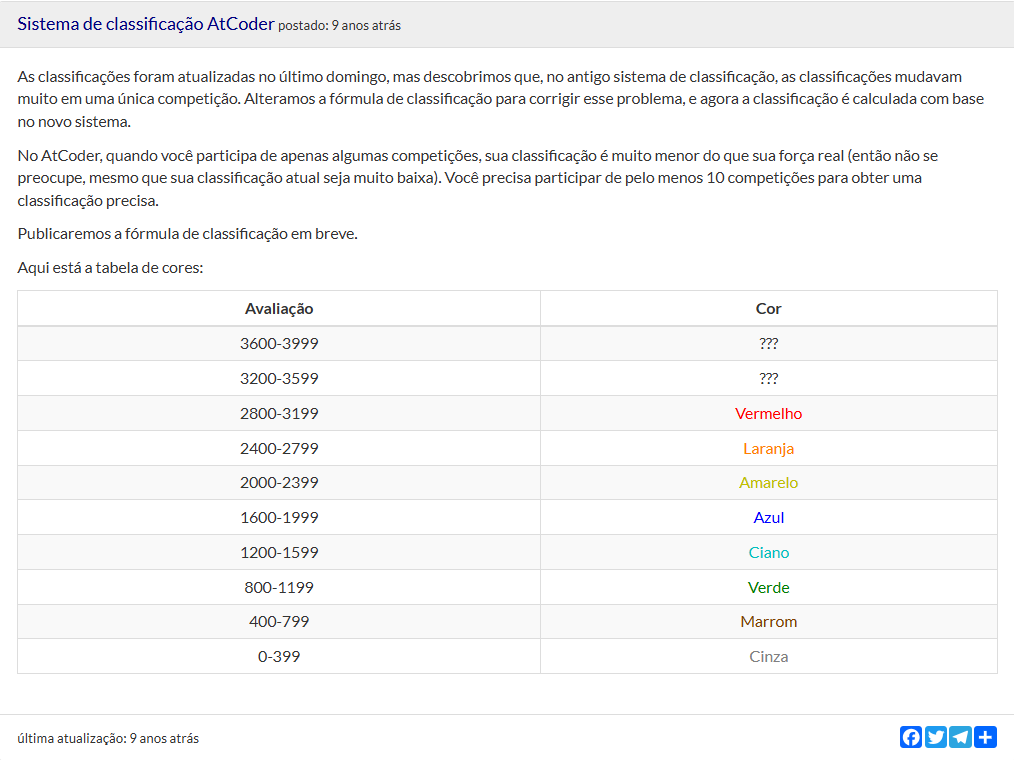 Cada usuário possui um rating, uma pontuação que varia conforme o desempenho nas competições. Esse sistema permite que você acompanhe seu progresso e se compare com outros competidores ao redor do mundo.