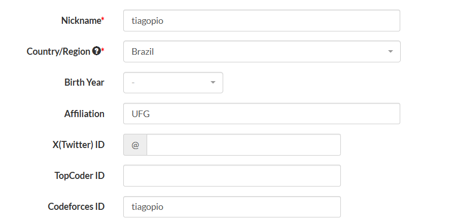 Após criar sua conta no AtCoder, você pode se afiliar aos competidores da UFG que também utilizam o site. Para isso, acesse as configurações gerais do seu perfil e, no campo Affiliation, preencha com "UFG".