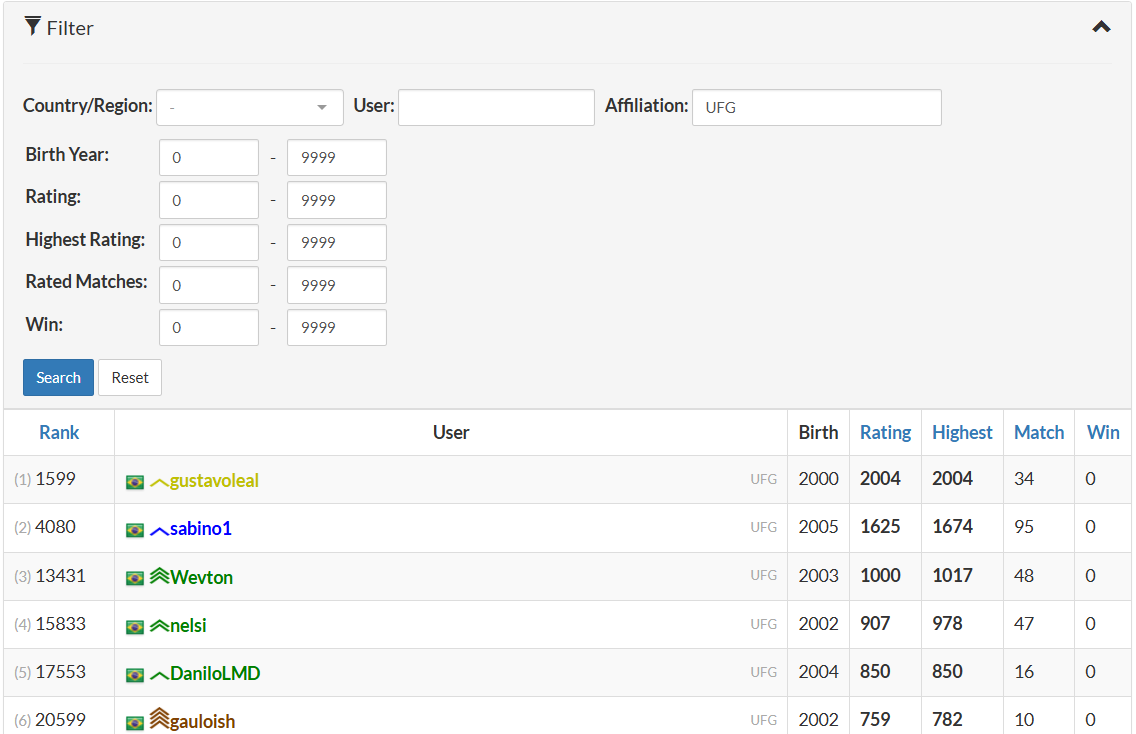 Isso permite que você filtre o ranking para visualizar apenas os participantes da UFG, tanto em classificações gerais quanto durante as competições.