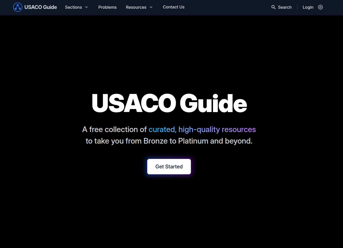 O USACO Guide é um site que serve como guia para as competições realizadas pela USACO, um judge feito nos Estados Unidos com foco em treinar seus competidores, geralmente do ensino médio, a participar de olimpíadas de programação. As competições realizadas na USACO são do mesmo estilo usado na Olimpíada Internacional de Informática (IOI) e, consequentemente, da Olimpíada Brasileira de Informática (OBI). Mas não vamos focar no site de competições, mas sim no guia que eles possuem, pois é o objetivo dessa sessão.
