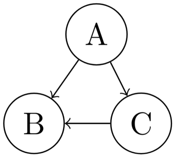 Por exemplo, no grafo abaixo, uma possível ordem de visita do DFS é \(A, B, C\). Quando estamos no vértice \(C\), o vértice \(B\) já teria sido visitado, porém ele não faz parte de um ciclo.